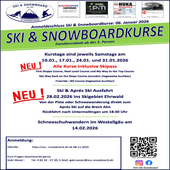 Abteilungsinterne Weiterbildung 28. - 30.11.2025 Sölden  Weihnachtsmarkt 14.12.2025 Untermeitingen                 Ski- & Snowboard Kurse 10., 17., 24. & 31.01.2026 Ausgewählte Skigebiete in Tirol   Schneeschuhwandern 14.02.2026 Westallgäu  Ski & Apres Ski Ausfahrt 28.02.2026 Skigebiet Ehrwald in Tirol Liebe Wintersportler,   Seit Jahren ist unser Ski- und Snowboardbasar der Startschuss für die Wintersportsaison. Somit starten wir am Samstag, den 08.11.2025, ab 15 Uhr im Sportheim Untermeitingen, Ungarnstr. 100 in Untermeitingen in die hoffentlich schneereiche Saison 2025/26. Wie jedes Jahr sind unsere Kooperationspartner INTERSPORT Hofmann und NO LIMITS mit tollen Angeboten und kompetenter Beratung für den alpinen Wintersportvor Ort. Unsere Sportwarte und Schnneesportlehrer helfen Euch gerne weiter mit Informationen und Beratungen zu unserem umfangreichen Ski- und Snowboard Kursprogramm. Natürlich wird auch unser kleiner Waffelstand mit Erfrischungsgetränken, Kaffeee und frisch gebackenen Waffeln wieder geöffnet sein.  Kommt vorbei, findet das passende Equipment  Informiert Euch über unser umfangreiches Wintersportprogramm Die Online-Anmeldung für unser Wintersportangebot ist ab 08.11.2025 freigeschaltet. Mit einer zeitigen Anmeldung sichert Euch die Teilnahme. Die Abbuchung der Gebühren erfolgt jeweils nach Durchführung des Events. Für Fragen stehen wir jederzeit unter Email info@svu-snowboard.de oder telefonisch unter 08232 3720 zur Verfügung.  Wir freuen uns auf euch!  Eure Abteilungsleiterin mit Schneesportlehrern Gabi Weser  Unser Neues Kursangebot:  First Stepps Course Ski & Snowboard (Dein Perfekter Einstieg in den alpinen Schneesport)    Next Level Course (Meistere die Pisten mit neuen Techniken)   My Way to the TOP Course (Perfektioniere deine Technik, erobere jede Piste und stelle dich mehr Herausforderungen im Funpark)   Back on the Slope Course (Zurück auf die Piste mit neuem Schwung)   Freeride - NO Course (Fahr mit uns ins Skigebiet & gestalte deinen Tag auf der Piste selber)   Familienrabatt ersetzt die Geschwisterkindermäßigung: Die Geschwisterkindermäßigung haben wir ersatzlos gestrichen. Neu eingeführt haben wir den attraktiven Familienrabatt. Der Familienrabatt findet Anwendung auf alle Familienmitglieder, unabhängig davon, welche Kombination der oben aufgeführten Angebote gebucht wird. Und so schaut der Familienrabatt aus: 2 Personen					10,00 € 3 Personen					25,00 € 4 Personen					45,00 € für jede weitere Person	25,00 € Termine Aktuelles click for more information click for more information Weitere Informationen Weitere Informationen Preise Wintersportprogramm Preise Wintersportprogramm